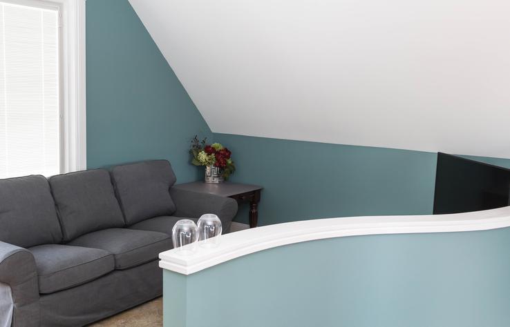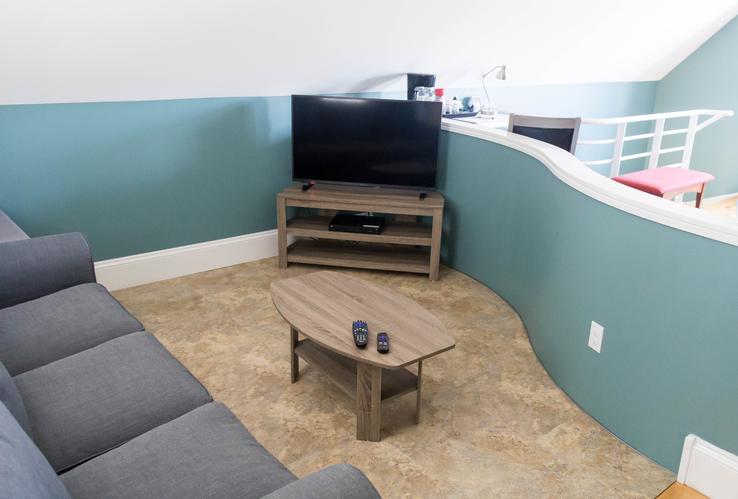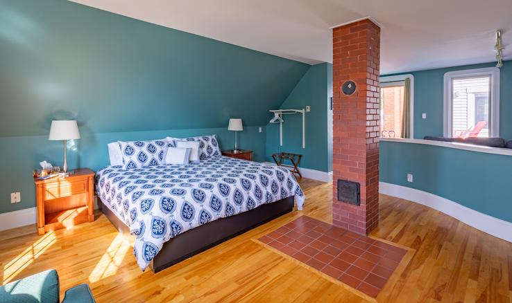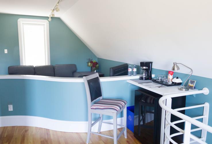 This 432 sq ft upper level West Wing features a luxury King bed, private 4 pc bath. Living room has a wonderful comfy sofa.